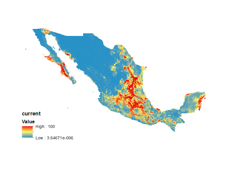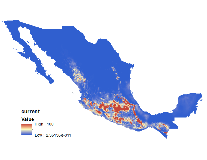The Maxent software will be used to analyze climate projections for future species distributions and how this will alter habitat connectivity. The environmental variables I will be using is precipitation, temperature, bioclim, as well as a set of georeferenced occurrence locations. This will produce a model of the range of the given species. For the current and projected climate change data I will be using the same environmental variables: min. temperature, max. temperature, precipitation, and a set of bioclim (1-19) data. Current projections include representation from 1950-2000. Future projects will be split into 2050 and 2070 climate predictions. Future conditions are modelled under IPCC AR5 because it is the most recent and policy relevant model. The scenario I chose was rcp8.5 because it is the most commonly cited in the literature. It is a scenario that describes increasing greenhouse gasses over time. The extent of the data is in region B2 only, which excludes most of the globe expect my study are of Mexico.